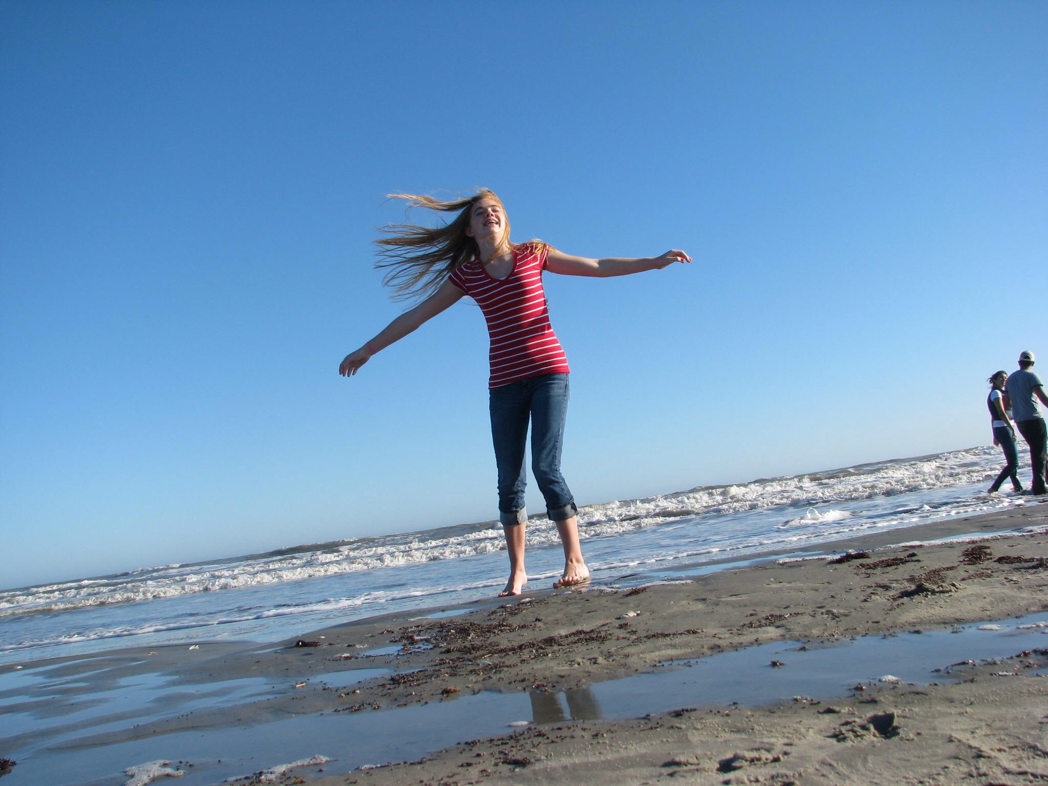 My friend and her daughter came to visit this past weekend. Hanging around young people helps me feel young. We enjoyed the beach, visiting Space Center Houston, watching movies and eating cookies and popcorn. I felt like a teenager until this moment on the beach. Teenagers can twirl and jump on the beach without warming up, stretching or causing a minor earthquake upon landing.