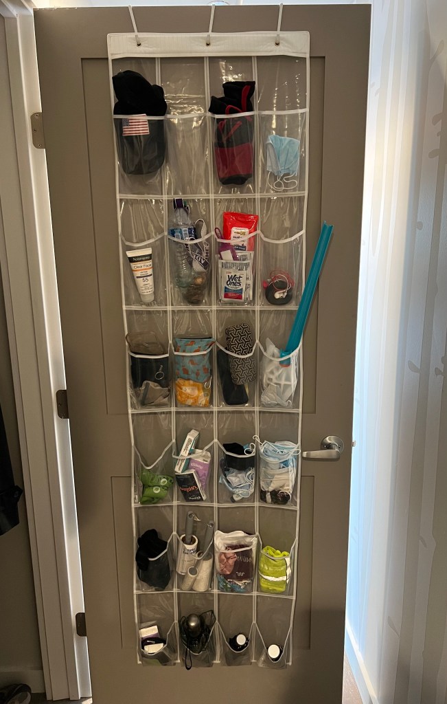 When I was younger, I carried a purse that weighed nearly 5 lbs with everything I could possibly need for the day. Now that added weight is hard on my joints, it’s beneficial to keep extra baggage to a minimum. Living in the city now means I leave the apartment 4, or more, times a day for various purposes. Sometimes, I’m simply walking the dog around the corner. For those walks, I only need a poop bag and my phone. If I’m just picking up a muffin next door, I only need a $10 bill and my phone. My phone is a constant because my keys are now all virtual and accessed by app. If the walk is a shopping walk, I might need to add credit cards and ID, hat for the sun, sunglasses, chapstick, hand sanitizer, kleenexes, masks, a bag for carrying purchased items, etc. The method I’ve found that works best for me is to keep all of these important items in an over the door shoe holder such as this one.